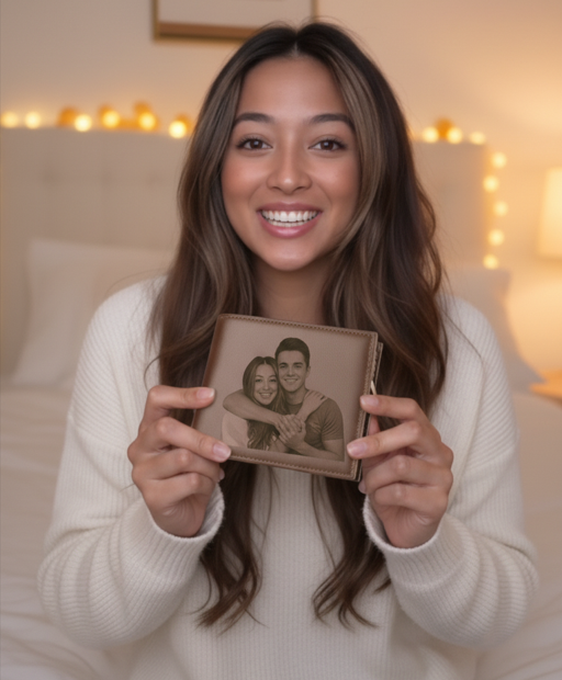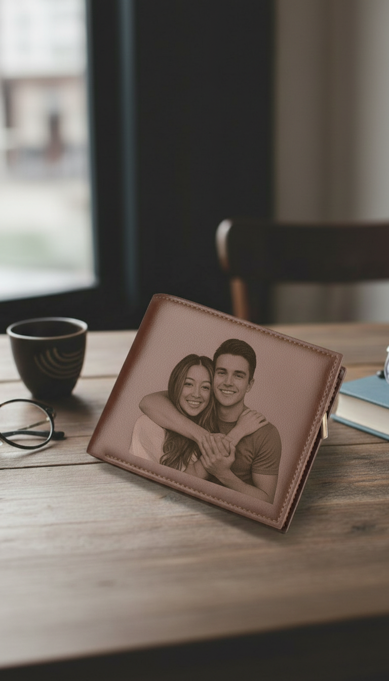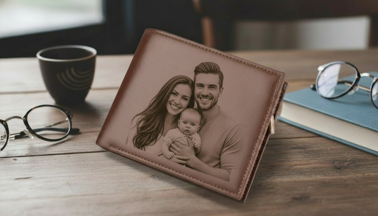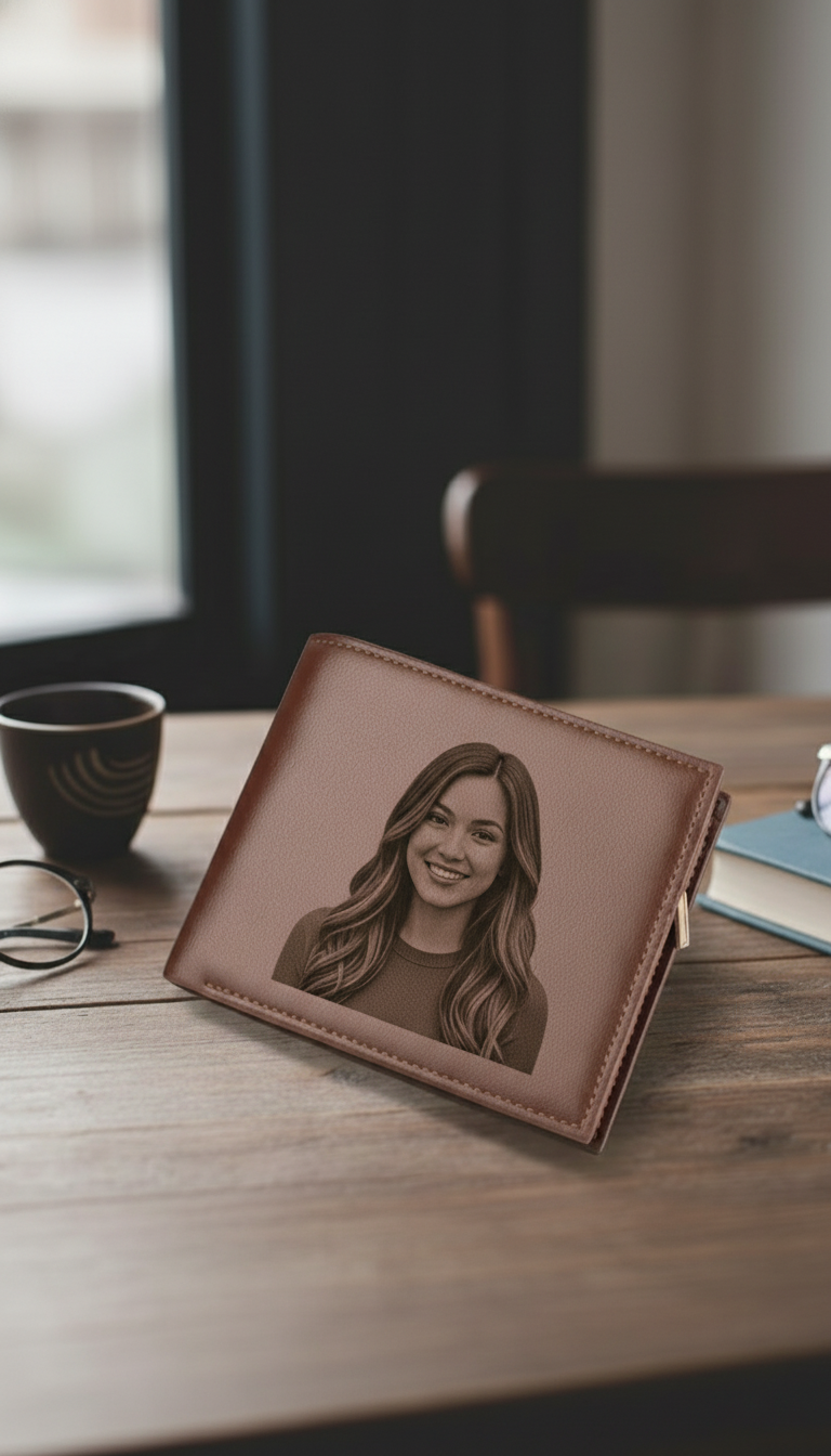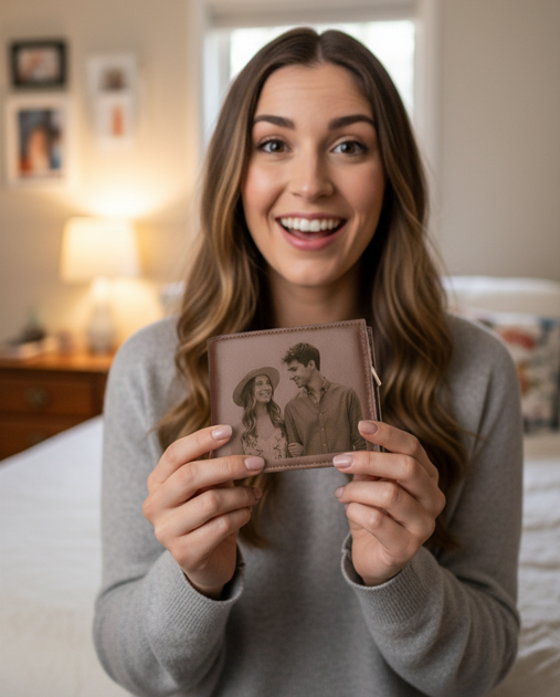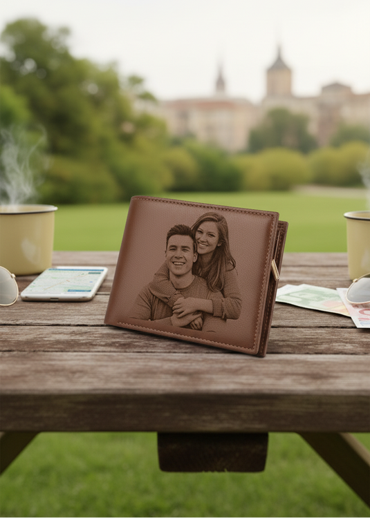 Un portefeuille en cuir véritable gravé avec votre photo préférée. Design ultra-fin élégant qui transforme l'ordinaire en extraordinaire.